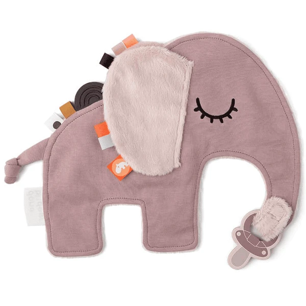 De zachte siliconen bijtring stimuleert en kalmeert jeukend tandvlees. De schattige olifant houdt fopspenen bij de hand. Met de handige klittenbandsluiting en elastische lus kunnen beide fopspenen met of zonder handvatten worden bevestigd.