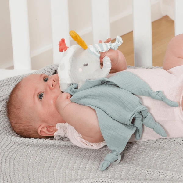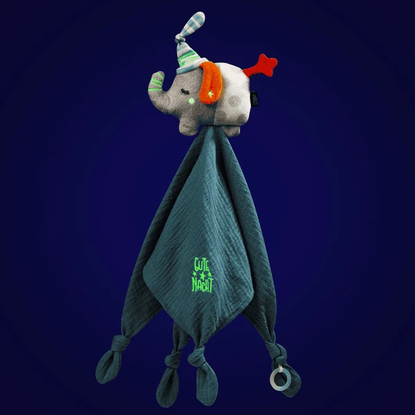 De knuffelzachte materialen, het kleine olifantje en de geknoopte uiteinden l aden nodigen uit tot vastpakken, voelen en knuffelen, zodat het knuffeldoekje zeker niet snel uit de hand zal worden gelaten. De siliconen ring kan gebruikt worden om snel een gewone fopspeen te bevestigen, zodat de kleine olifant altijd een oogje op baby’s fopspeen kan houden.