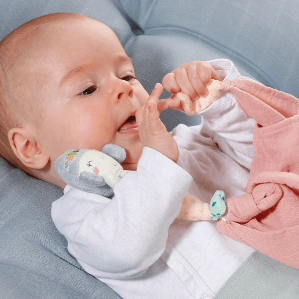 Het kleine zeediertje houdt van knuffelen en kroelen en is graag baby’s trouwe metgezel, zowel thuis als op reis. Bij het inslapen geeft de katoenen mousseline doek een gevoel van geborgenheid. De knuffelzachte materialen, de kleine zeemeermin en de geknoopte uiteinden l aden nodigen uit om vast te pakken, te voelen en te knuffelen, zodat het knuffeldoekje met zeemeermin zeker niet snel uit je hand zal worden losgelaten.