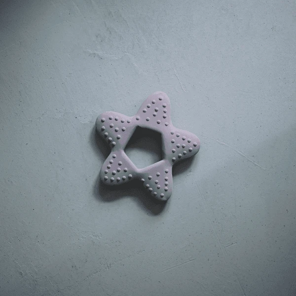 Stervormige bijtring gemaakt van 100% natuurlijk rubber. De ster heeft een gat in het midden, waardoor zelfs heel kleine handjes een goede grip hebben. Er zitten kleine puntjes op het oppervlak en alle randen zijn zacht, wat helpt bij pijnlijk tandvlees en tegelijkertijd de tastzin stimuleert. Geweldig product voor de ontwikkeling van de fijne motoriek van het kind.