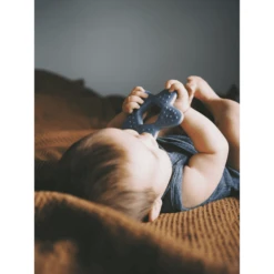 Stervormige bijtring gemaakt van 100% natuurlijk rubber. De ster heeft een gat in het midden, waardoor zelfs heel kleine handjes een goede grip hebben. Er zitten kleine puntjes op het oppervlak en alle randen zijn zacht, wat helpt bij pijnlijk tandvlees en tegelijkertijd de tastzin stimuleert. Geweldig product voor de ontwikkeling van de fijne motoriek van het kind.