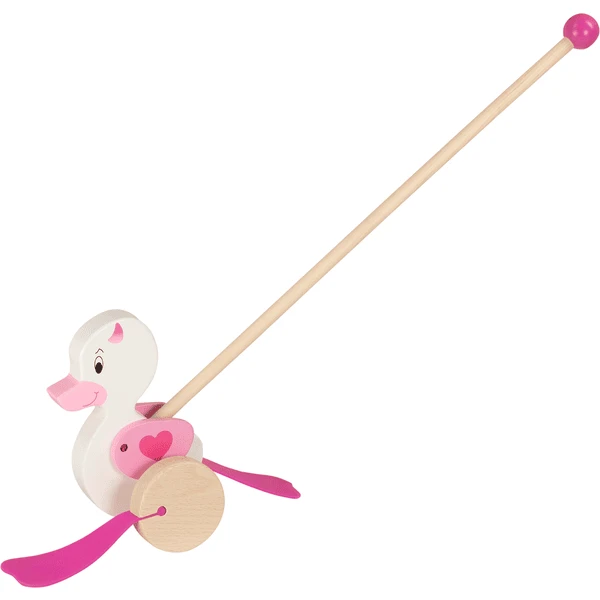 Als een duiveltje met een hartje zal de schattige eend met zijn grote pootvoeten, de schattige tred en de frisse kleurstelling de kamer van uw kind veroveren. Een houten speeltje dat er opvallend brutaal en levendig uitziet.