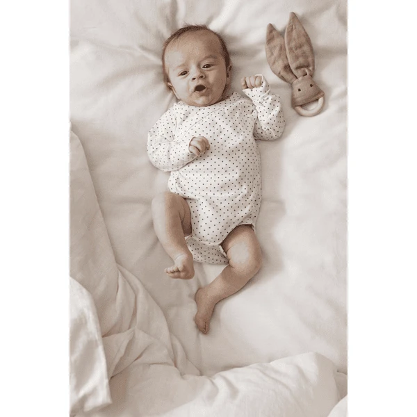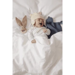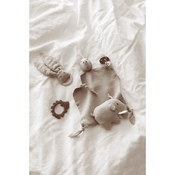 Het artikel kan in de machine worden gewassen en vervolgens gedroogd op een luchtige plaats. Linnengaren hebben lange rechte vezels met een gladde oppvervlakte, wat resulteert in een stof die ongeloofelijk goed ademend is. De gladheid van de vezels helpt het materiaal om vuil af te weren, en heeft het antibactieriele en hypoallergene eigenschappen. De linnen stof is sterk en duurzaam en is perfect voor baby speelgoed.