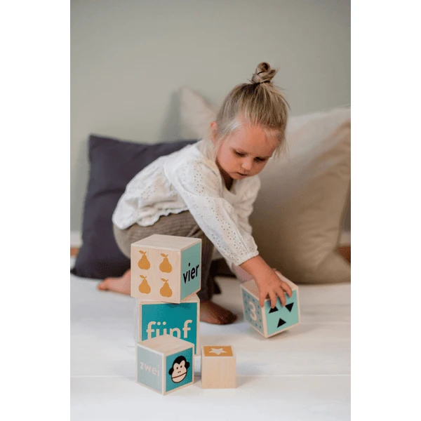 - 5 houten blokken met dierenmotieven: Om te stapelen en in elkaar te steken