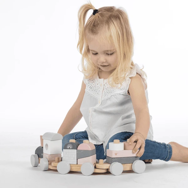 - De Label Label stapeltrein is gemaakt van hoogwaardig FSC-gecertificeerd beukenhout en is gedecoreerd met kindvriendelijke verf op waterbasis met mooie zachte tinten roze, wit en grijs.