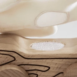 - Een eersteklas houten speeltje met veel zachte elementen en gegraveerde illustraties op de tak