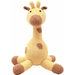 Deze prachtige handgemaakte knuffel heeft de vorm van een giraf. Dankzij het zachte bamboegaren nodigt de gele giraffe uit om te knuffelen en laat hij de ogen van de baby glimmen. Verder maakt de knuffel een heerlijk piepje als je op zijn buik drukt. Het artikel kan met de hand worden gewassen op 30 °C en mag niet in de droger worden gedroogd.