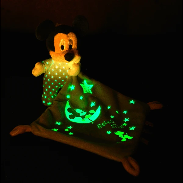 Mickey is gekleed in een lichtblauw rompertje en houdt het knuffeldoekje stevig in zijn hand. Op het donzige knuffeldoekje zit Mickey op de maan, omringd door een heleboel sterren. Als het donker wordt, beginnen de sterren en de elementen op de deken te gloeien. Zachte glinstering begeleidt de kleintjes naar bed.