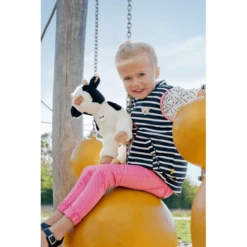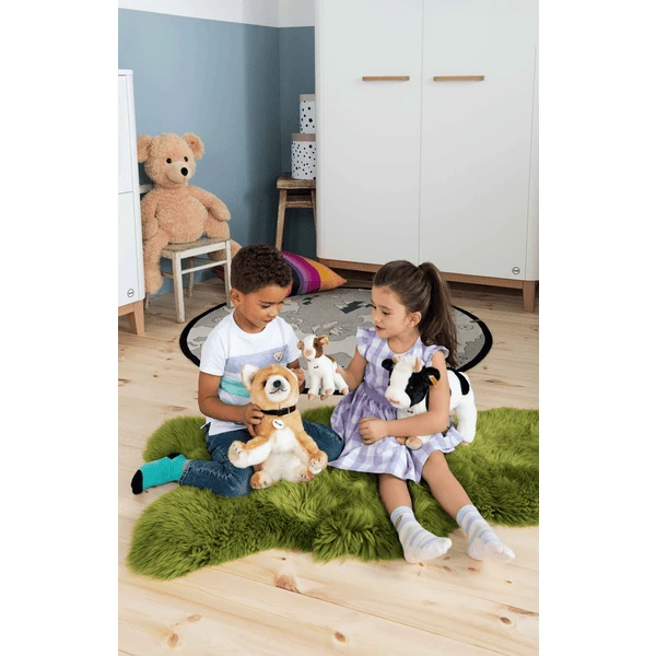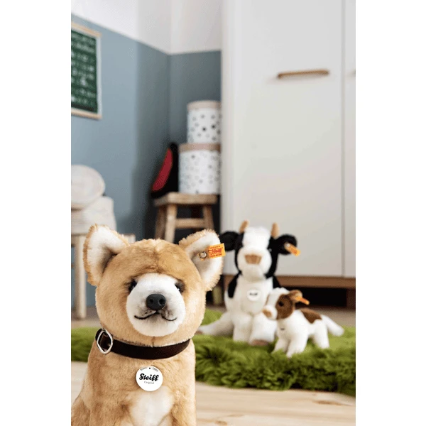 Luise de kalf is 32 cm hoog en gemaakt van een knuffelkalfje van zacht zwart en wit pluche. De hoeven en de zolen zijn beige. Ook de neus en de hoorns. Luise is erg trots op haar typische kapsel van langer crème pluche. Een plukje ervan siert ook het gezicht boven de neus. De roze tint op de neus maakt Luise’s vriendelijke uitstraling compleet. Na lang spelen op de boerderij ligt het kalf eerst tot rust te komen.