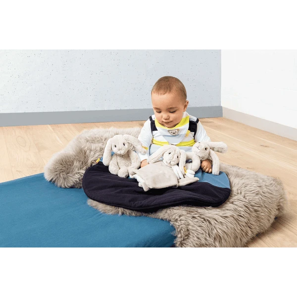 Haar knuffelige konijnenkop met geborduurde ogen en hartvormige neus nodigt kleine handjes uit om op onderzoek uit te gaan. Hoppie is altijd vol ideeën en avontuurlijk: als ze speelt, wapperen haar lange oren, haar armen en benen doen mee met elke beweging, ze gaat ondersteboven en onder.