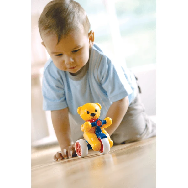 - Laat je peuter zien hoe je Teddy op zijn fietsje krijgt door zijn hoofd naar beneden te duwen